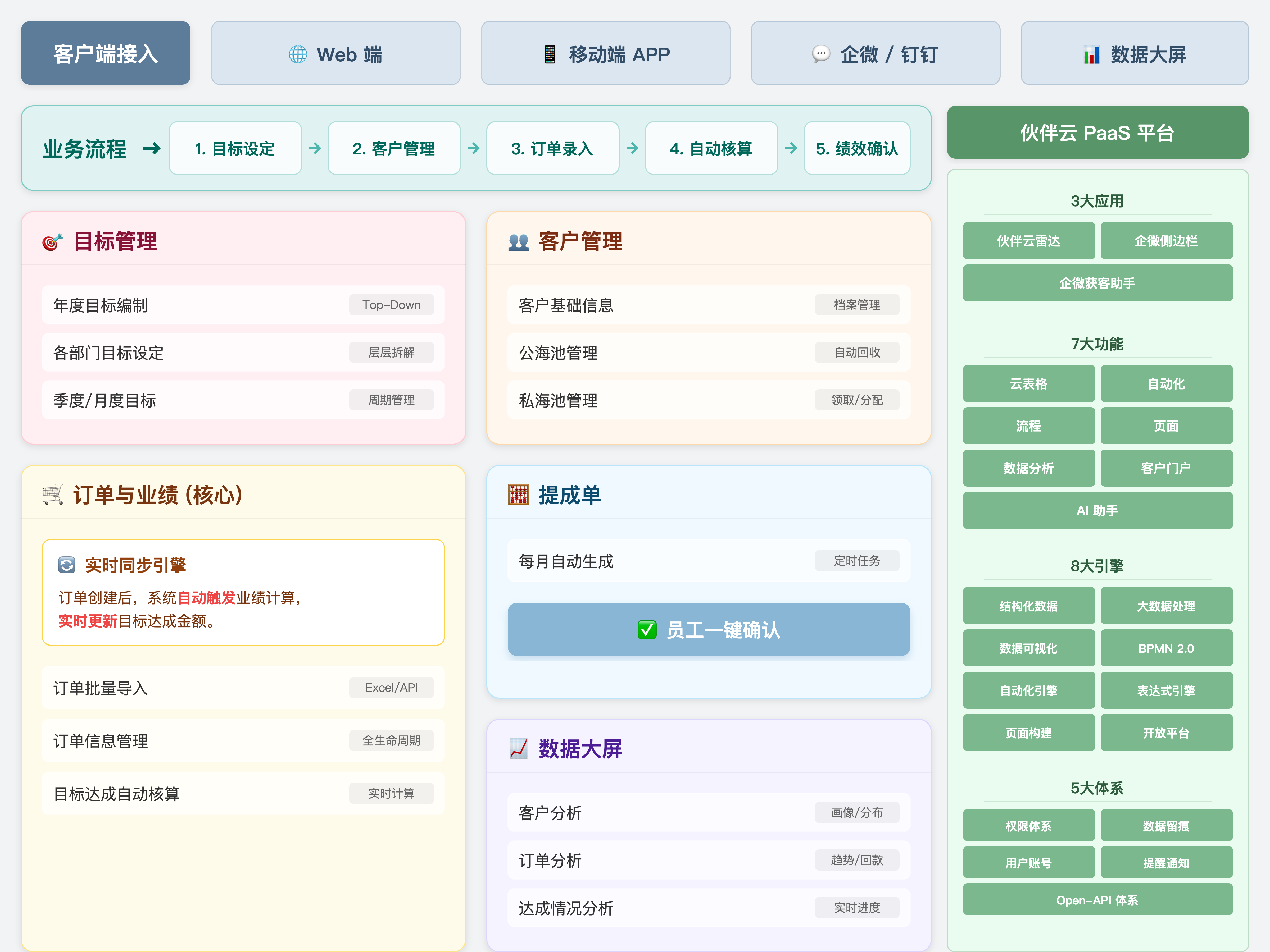 - 传统CRM系统功能臃肿、实施费用高昂,且固化的流程难以适配中小企业灵活多变的**提成规则(**如按毛利、按回款、阶梯提成等);