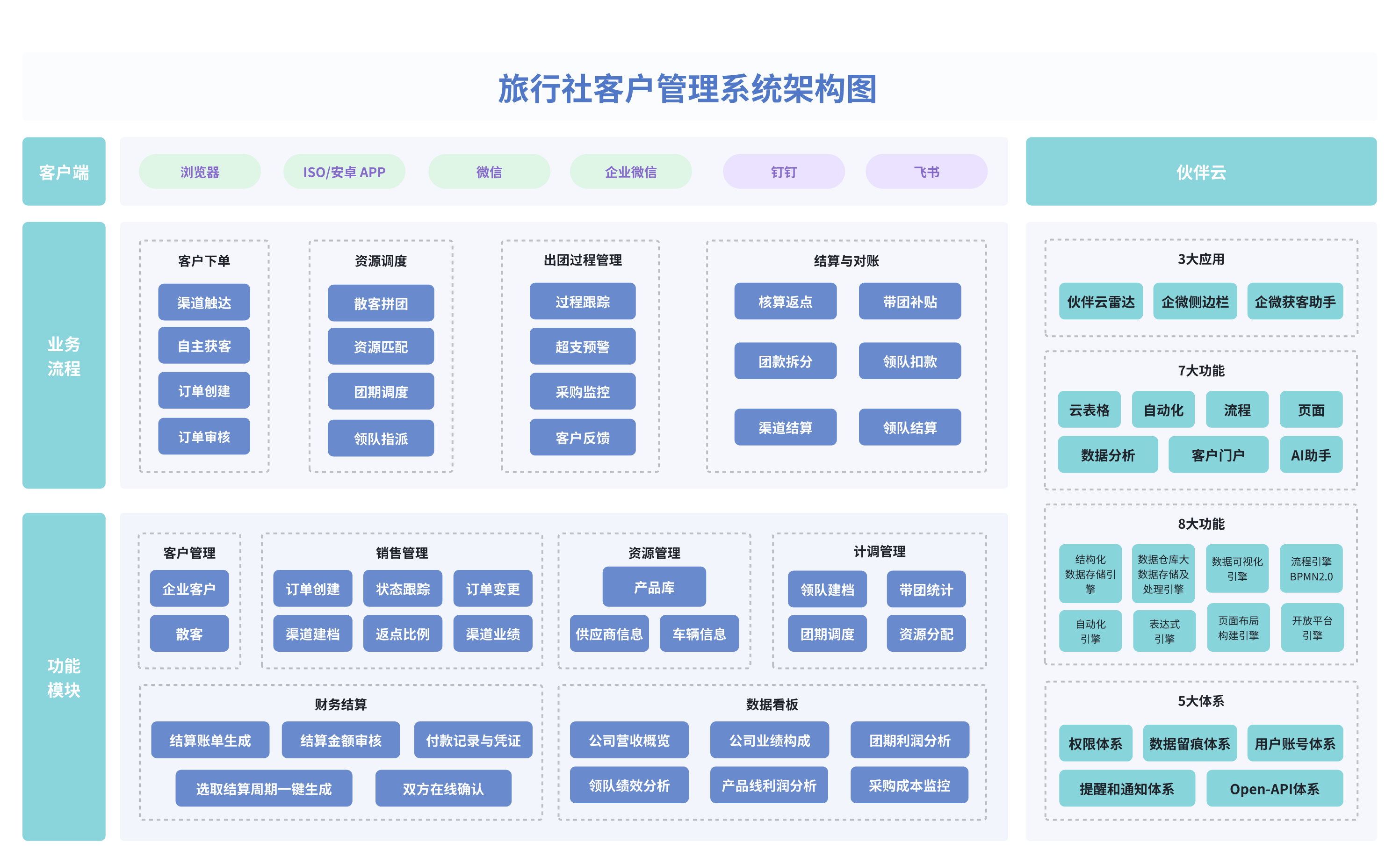 • 同时经营渠道代理、接收直客、企业定制团等多种业务模式,需要一套系统能清晰区分并统一管理这些业务